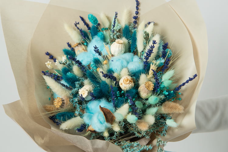Un buchet din flori uscate în nuanțe de crem, alb, lavandă și albastru intens, realizat manual din plante naturale selecționate. Este ideal pentru cei care își doresc o piesă decorativă cu personalitate, dar fără grija întreținerii.