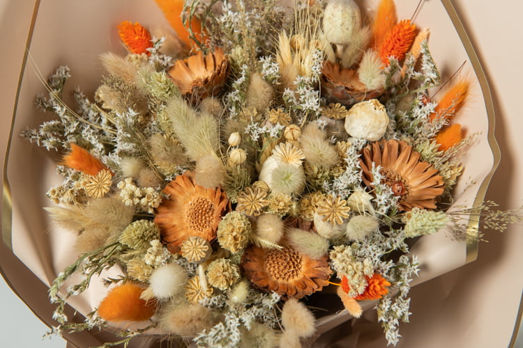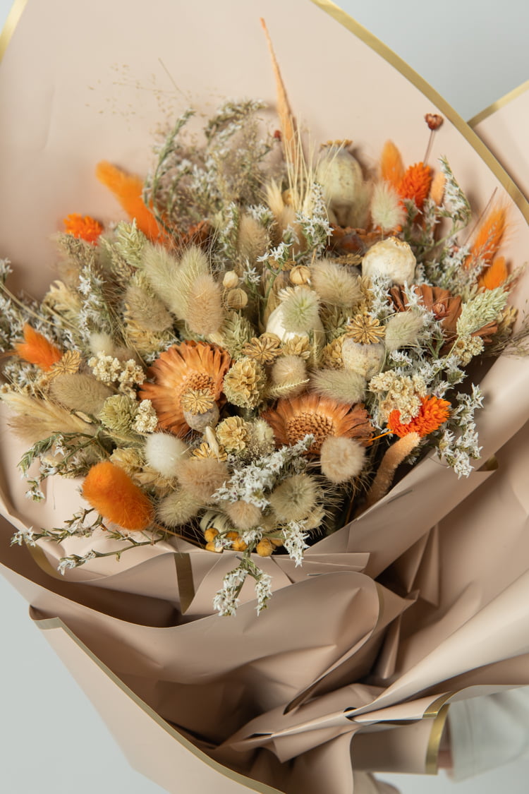 Acest buchet din flori uscate este realizat manual dintr-un amestec echilibrat de plante naturale în nuanțe neutre și accente calde, precum bej, crem, portocaliu și alb. Textura diversificată și aspectul aerat îl transformă într-o alegere potrivită pentru spații care își doresc un element decorativ discret, dar cu impact vizual.