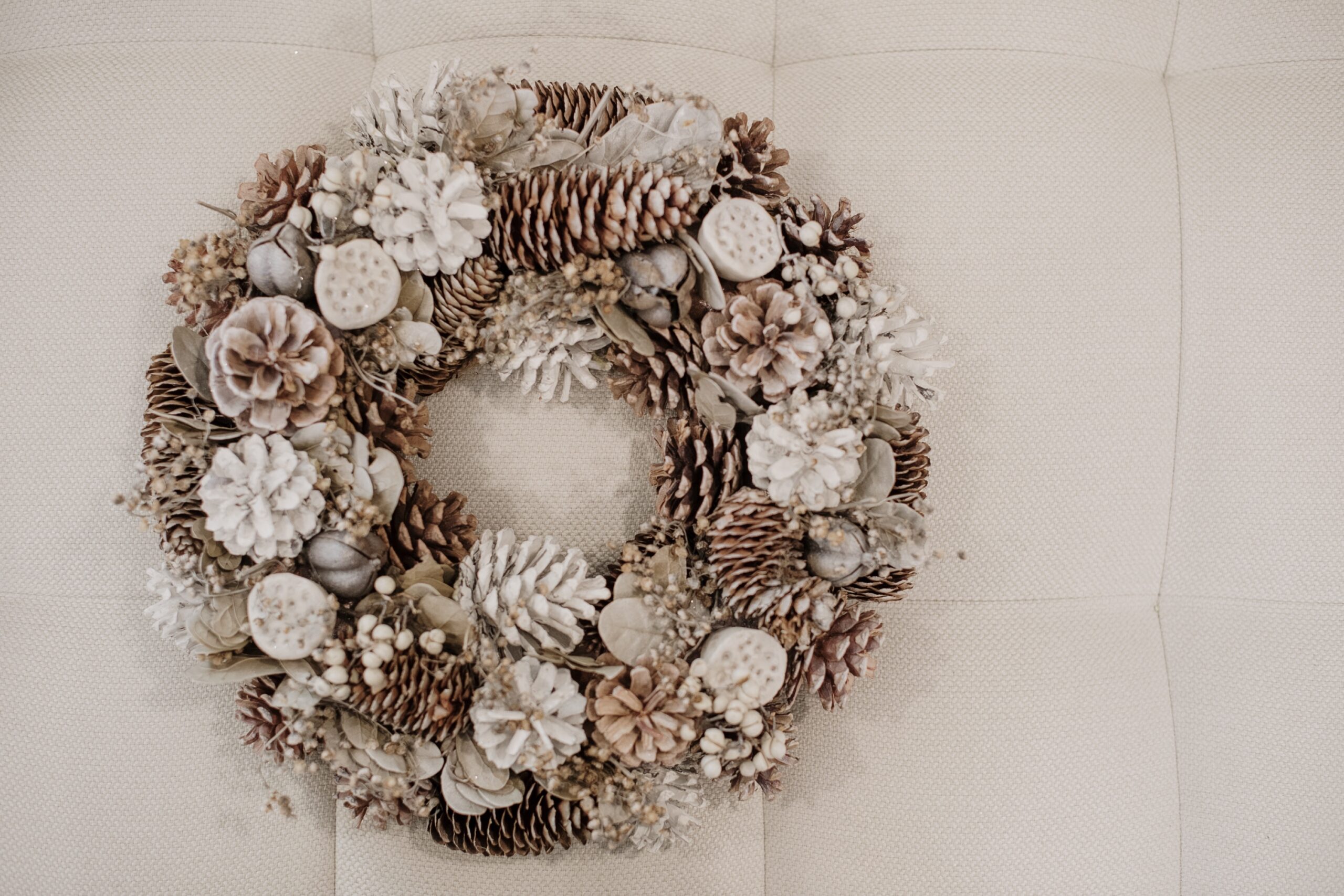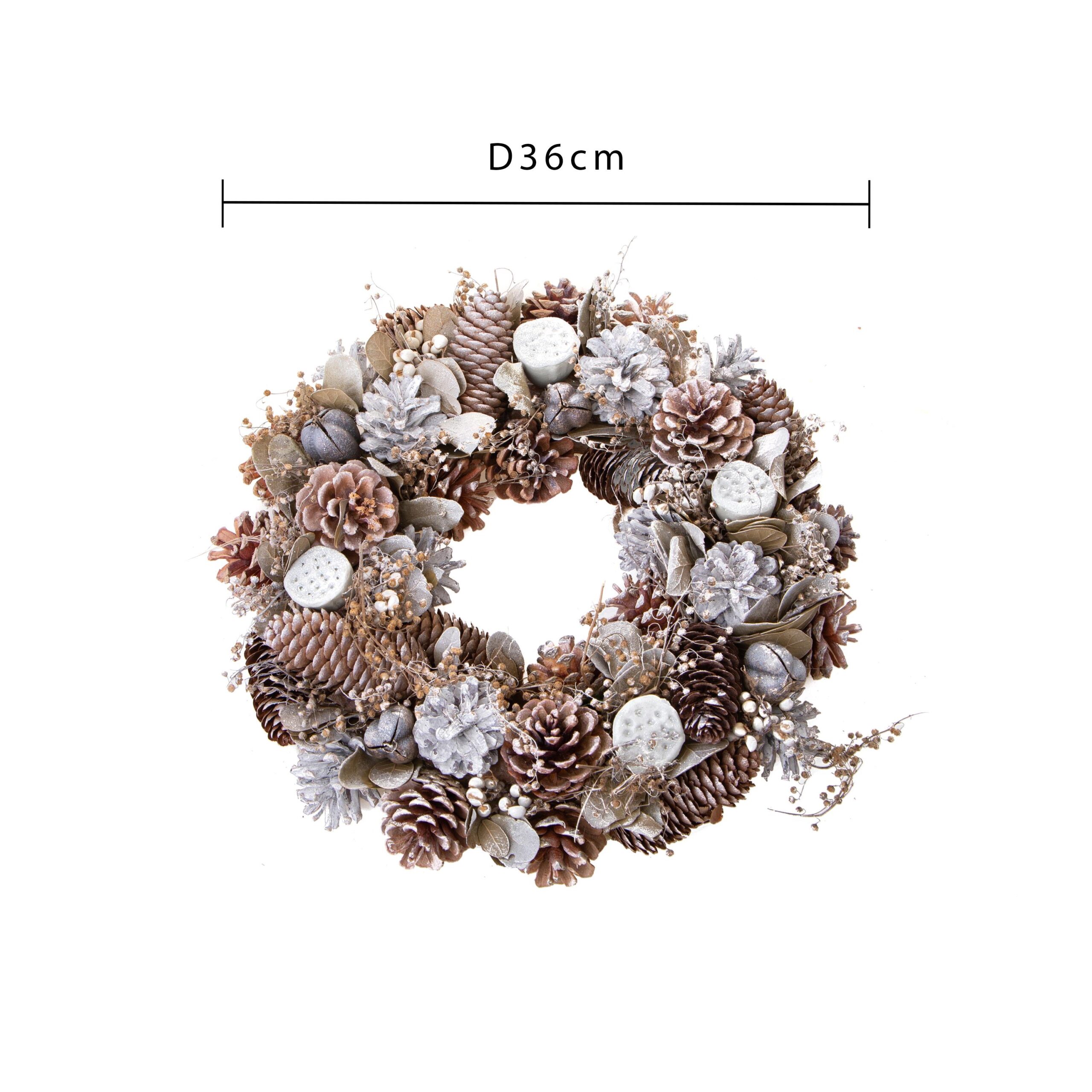 Coroniță de Crăciun cu conuri albe și accente naturale – 36 cm