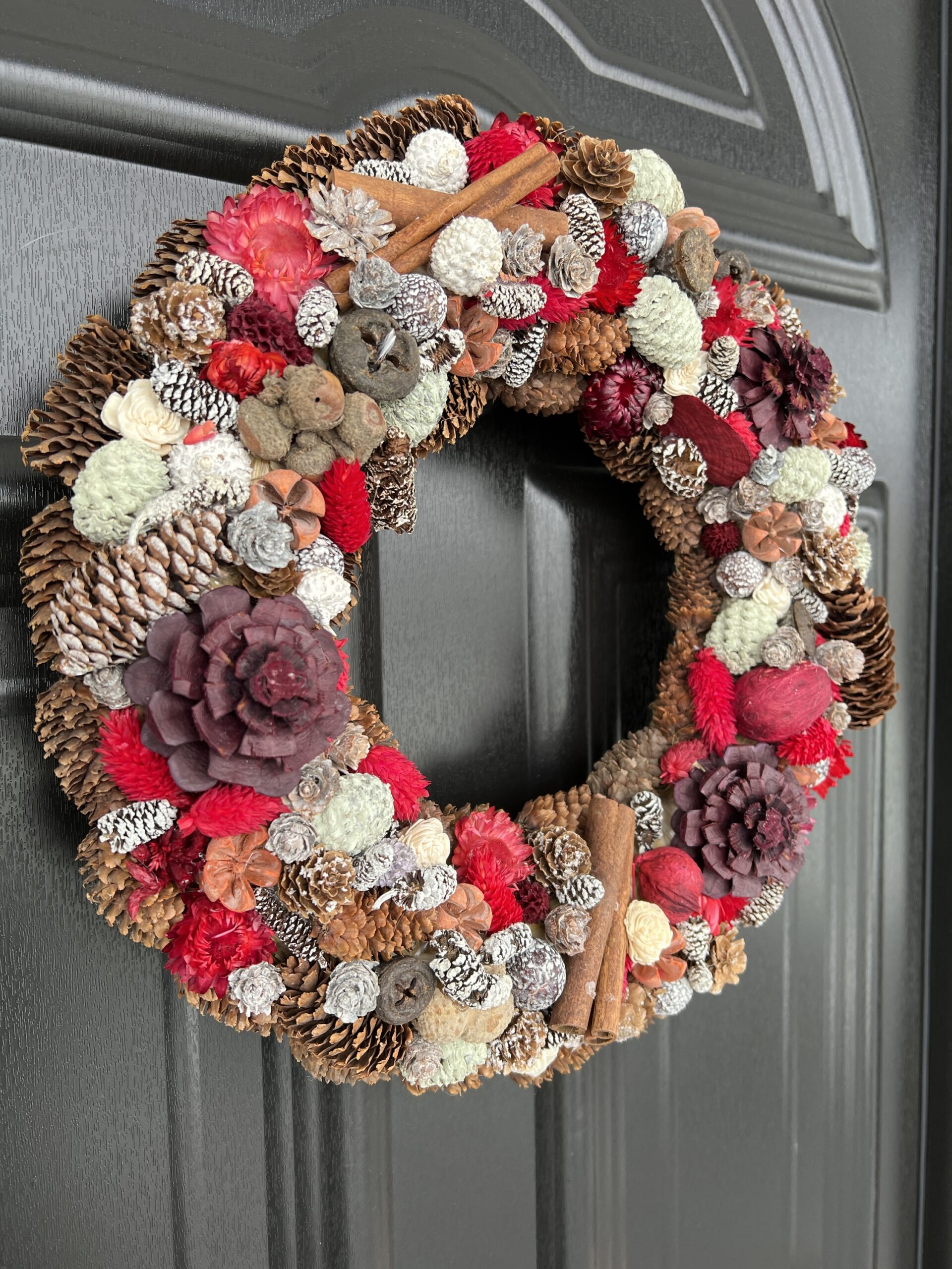 Coroniță de Crăciun cu conuri de brad și accente roșii – 32 cm