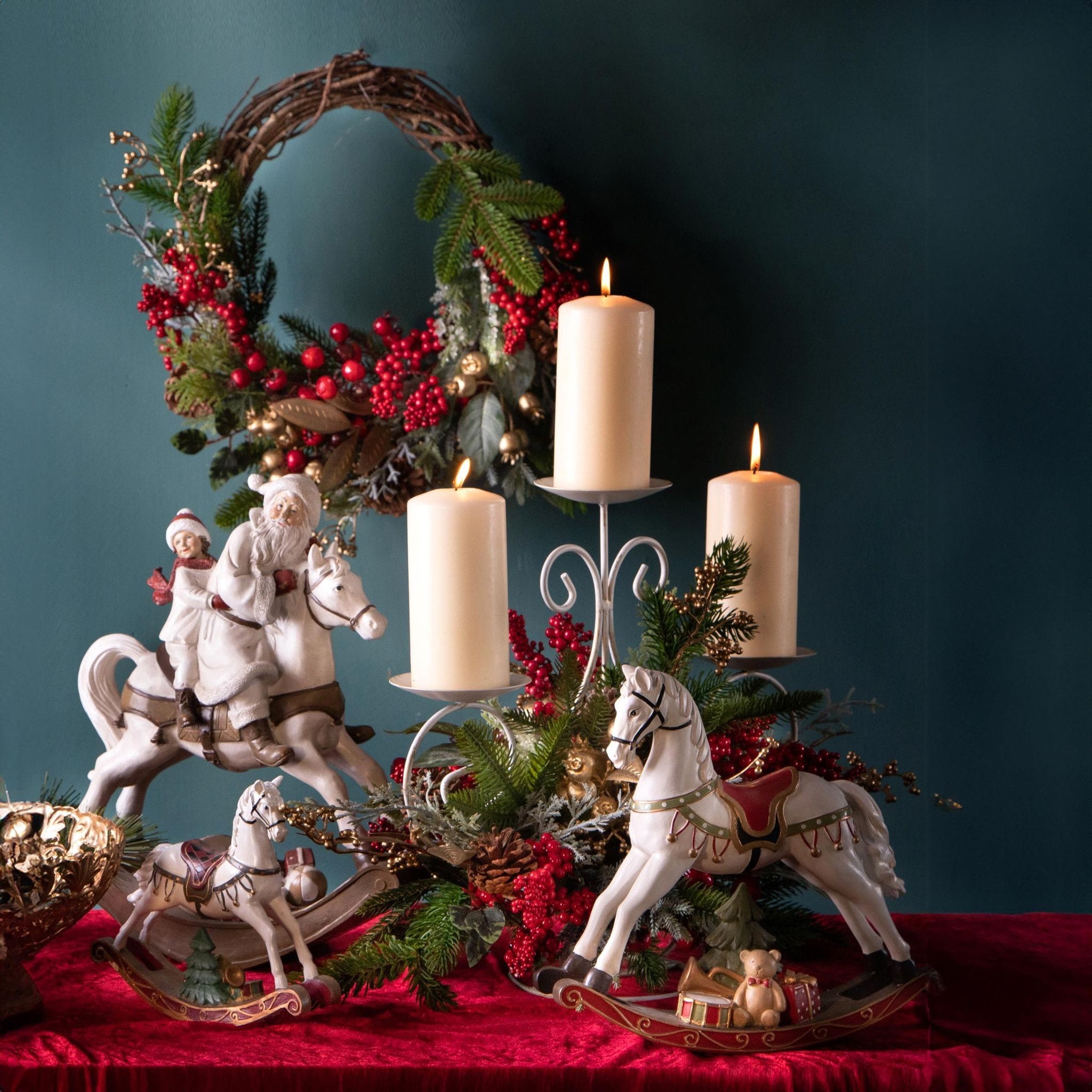 Acest aranjament de Crăciun este conceput pentru a fi un element central al mesei festive, având un design echilibrat, cu detalii atent lucrate. Combină crenguțe de brad, conuri, accente aurii și roșii, creând un contrast plăcut și un efect vizual armonios. Structura metalică elegantă permite amplasarea lumânărilor, adăugând un plus de rafinament și căldură în decor.