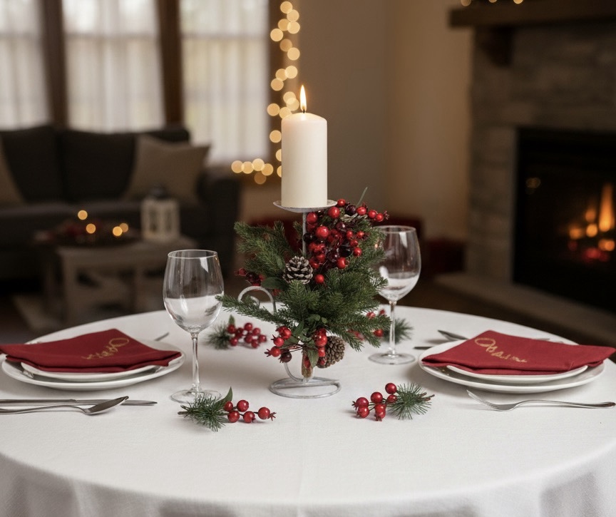 Acest aranjament de Crăciun cu lumânare este potrivit pentru decorarea mesei festive sau pentru a completa atmosfera sărbătorilor. Realizat din crenguțe de brad, elemente naturale și accente discrete, are un design echilibrat, potrivit pentru orice tip de amenajare. Lumânarea centrală adaugă un plus de căldură, iar combinația de culori și texturi creează un efect armonios.