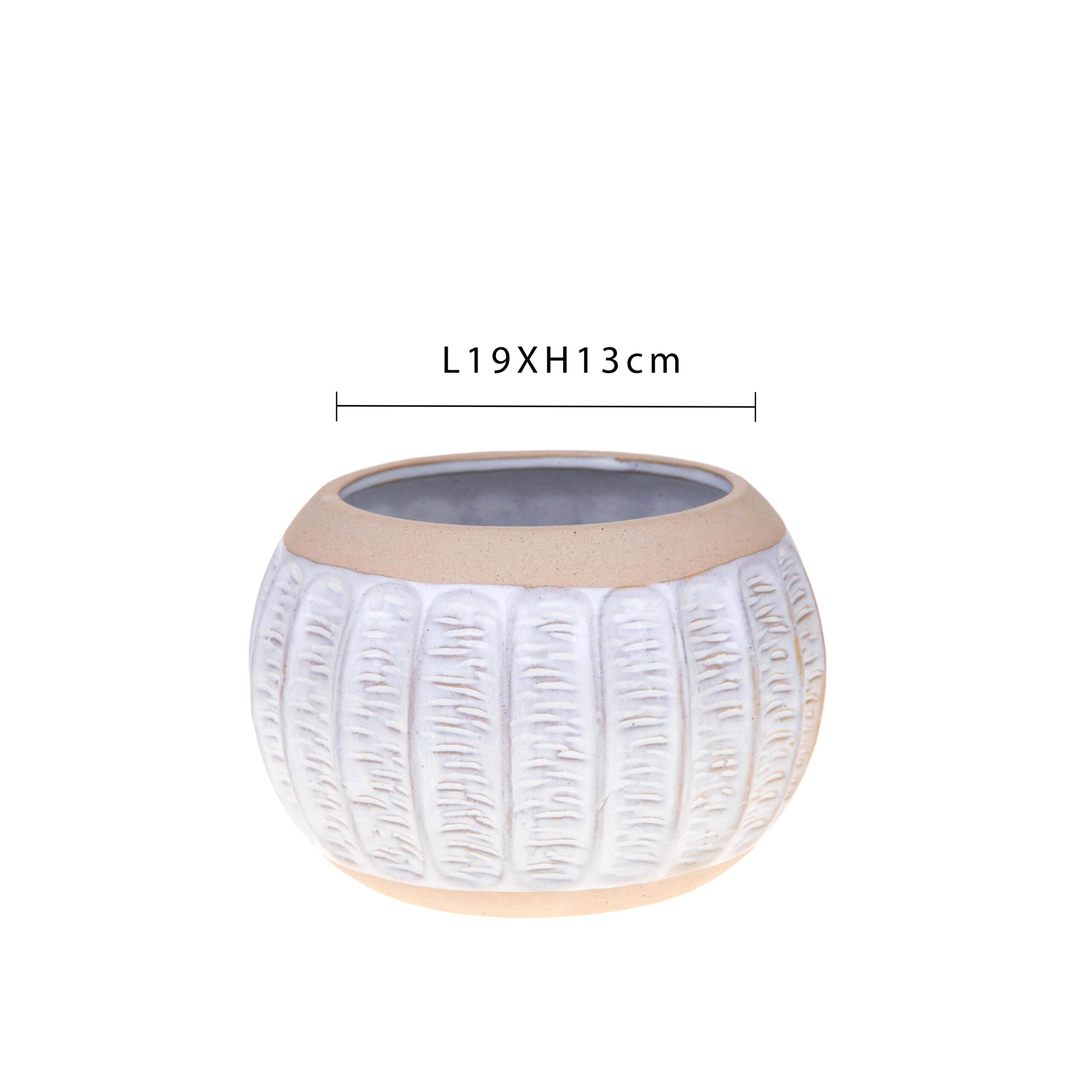 Realizat din ceramică de calitate, cu finisaj crem/bej, ghiveciul aduce un plus de căldură și eleganță oricărui spațiu — living, birou, recepție sau amenajări comerciale. Dimensiunile sale generoase, 19 cm diametru și 13 cm înălțime, îl fac ideal pentru aranjamentele Greenest Craft care pun în valoare naturalețea și armonia.