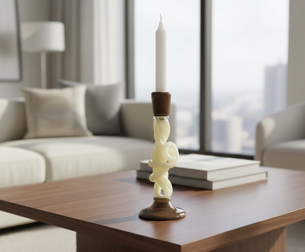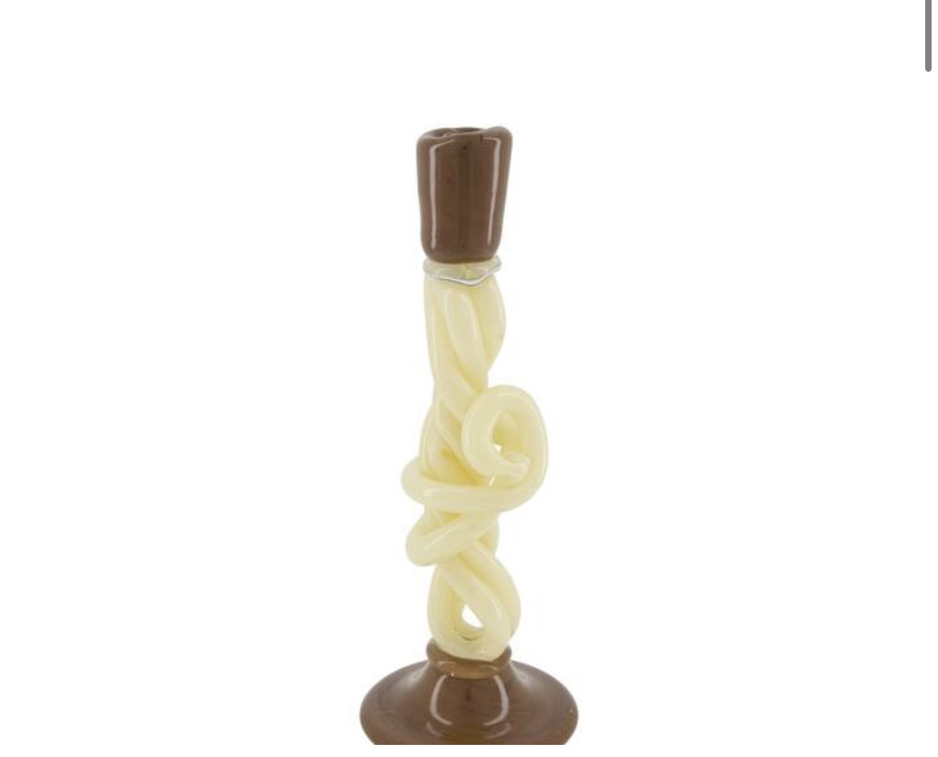 Adaugă o notă elegantă cu acest suport de lumânare din sticlă, cu design spiralat Crem/Maro. Material de calitate, înălțime 30 cm. Perfect pentru un decor rafinat.