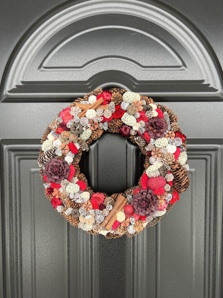 Coroniță de Crăciun cu conuri de brad și accente roșii – 32 cm