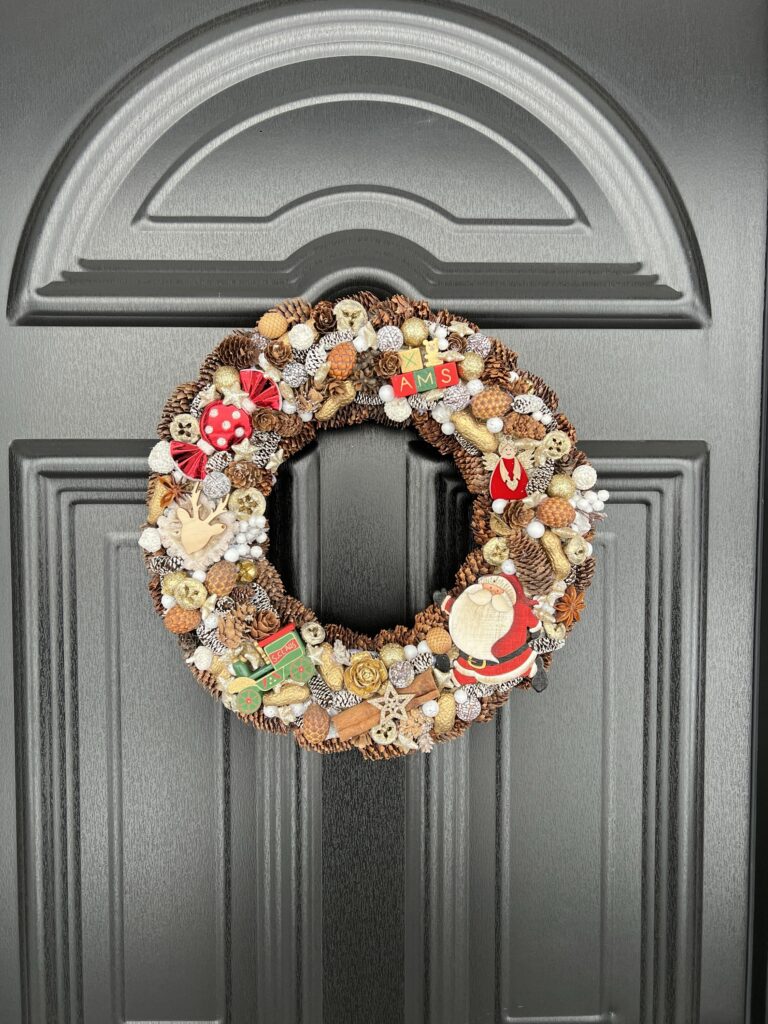 Coroniță de Crăciun cu conuri de brad și figurine festive – 35 cm